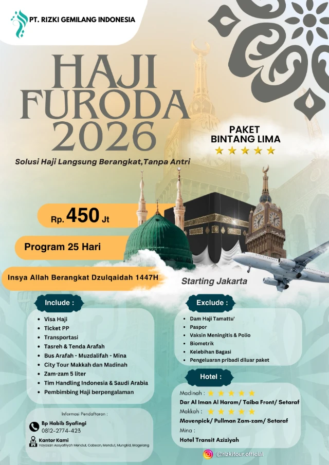 Program Haji Furoda 2026 dengan kepastian keberangkatan langsung, fasilitas bintang lima, dan pendampingan profesional sejak dari Indonesia.